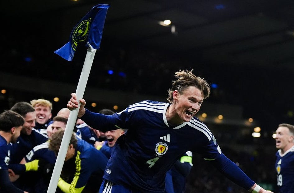 Houve um momento em que a Escócia estava se classificando à sua primeira Copa do Mundo desde 1998 graças a um gol de bicicleta, e aí o papo era quem é maior, Scott McTominay ou William Wallace, mas eles tiveram que buscar o resultado mais duas vezes e ainda marcaram do meio-campo aos 53 minutos do segundo tempo, então deu uma diluída.
