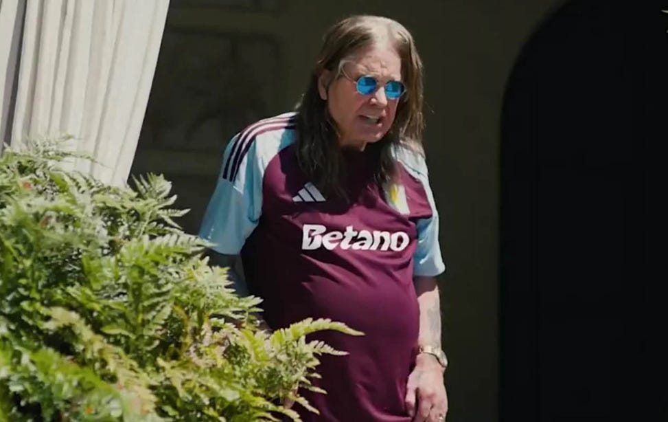 Ficou genial a propaganda para o lançamento da camisa do Aston Villa em 2024/25, a que foi usada na volta à Champions League. Ozzy aparece debilitado, mas com seu carisma intacto, ao lado de Geezer Butler. Pede suas chuteiras à esposa Sharon, que faz uma pontinha calçada com as clássicas Adidas Predator. Mas nada melhor que o momento no qual Príncipe das Trevas é anunciado como camisa 11 e se autodefine como o “maior homem de frente a já ter surgido em Birmingham”. A mais pura verdade. Ao som de Paranoid, a voz inconfundível grita o igualmente característico “Up the Villa!” no fim.