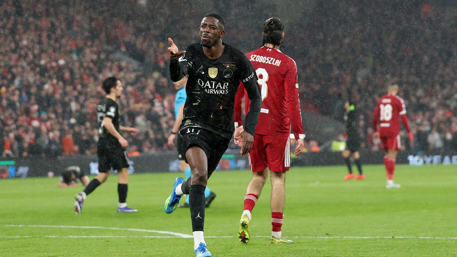 - A temporada tem sido complicada para Ousmane Dembélé, a principal vítima das exigências físicas da Tríplice Coroa do PSG. Mas no momento em que o Liverpool apertava para ressuscitar nas quartas de final, ele apareceu para decidir. Depois da década dominada por Lionel Messi e Cristiano Ronaldo, precisamos nos acostumar com melhores jogadores do mundo que são meramente mortais. O atual campeão lidou bem com as duas mãos. Poderia ter aberto o placar em Anfield e limitou o Liverpool a espasmos em que dava para acreditar em uma reviravolta. Sabia que, em algum momento, haveria abertura para contra-ataques e nem precisava tê-los aproveitado para se classificar. Podemos parar de esperar que o PSG atinja o nível da temporada passada. Ele já chegou a um patamar bem elevado, que o permite sonhar com o bicampeonato.