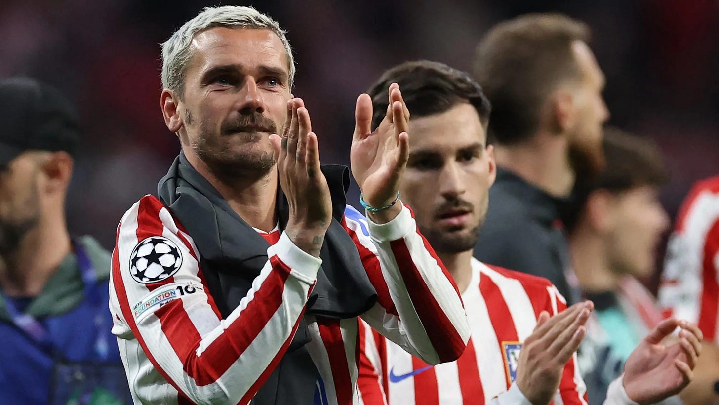 Julián Álvarez é o principal símbolo dessa mudança. São nove gols em 13 jogos de Champions League — quase o mesmo número que marcou em 29 jogos de La Liga. É um jogador que cresce nos jogos grandes e praticamente dobra seu volume ofensivo na Europa em relação ao campeonato nacional. Antoine Griezmann, que saiu do Atlético em 2019 rumo ao Barcelona parcialmente por frustração com um papel de mais sacrifício do que criatividade, voltou ao clube e, numa temporada que indicava que jogaria menos, cresceu com a equipe para se tornar mais decisivo nos jogos que mais importam — ironicamente, num time que agora oferece o que ele sempre quis: liberdade para atacar. O arco é quase literário.